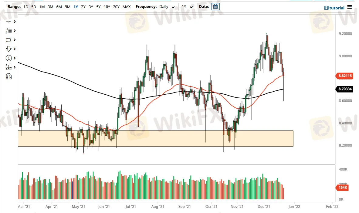 If we were to somehow break down below the bottom of the candlestick for the trading session on Thursday, that would be the bottom falling out of this market and at that point I am not even sure where we end up, maybe somewhere near the 8.2 level based upon the most recent bounce from that area? Regardless, the candlestick that we see for the session on Thursday have to be somewhat ignored, because that move almost certainly had to do with the time of year