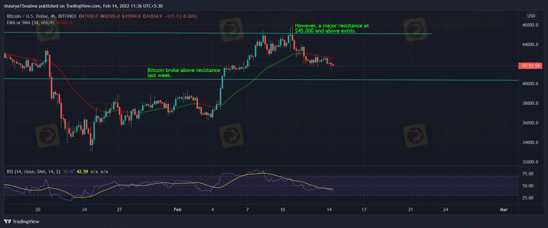 Bitcoin has shown strength this month after a slide to yearly lows of $33,000 in January. It broke above the $38,000 and $41,500 resistance level in the first week of February to monthly highs of $46,000, a level previously seen in the final weeks of 2021.