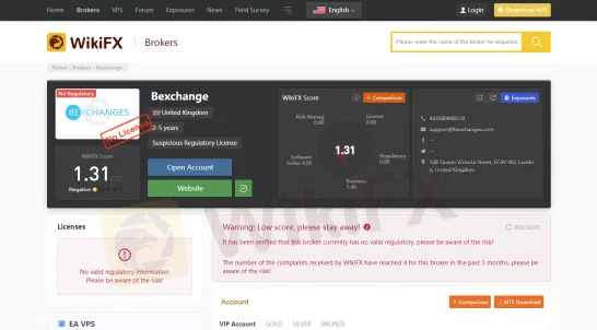 Bexchange, also called Bexchange Solution Limited, was established in 2020. As per the website, the company is located in London, UK. However, it seems that the reality is a little bit different. As a UK-based company, Bexchange should have FCA approval for providing financial services. However, what we did find is a company with the same name registered in Belize, we can not identify the actual headquarter of Bexchange. Besides, this broker currently doesnt have a legitimate license. And it has been given by WikiFX a very low rating of 1.31/10. Therefore, please note the reliability of Bexchange before you make a right decision.