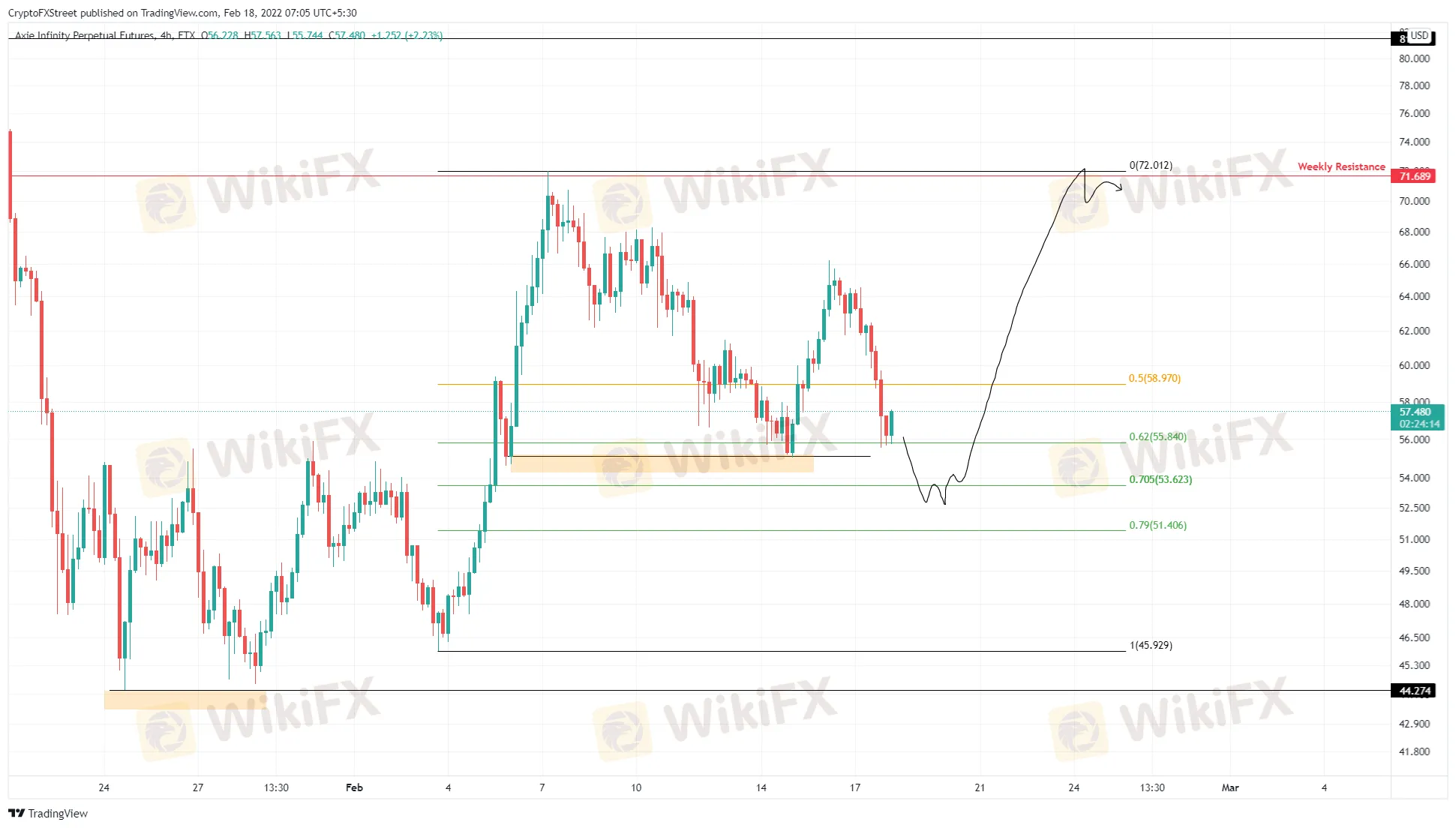 Axie Infinity price set a range, extending from $45.93 to $72.01 as it rallied 56% between February 3 and 7. This exponential upswing took a break at $55.11 and set a swing low there. The retracement from the range high set up another swing low around $55.11, creating a double bottom formation.