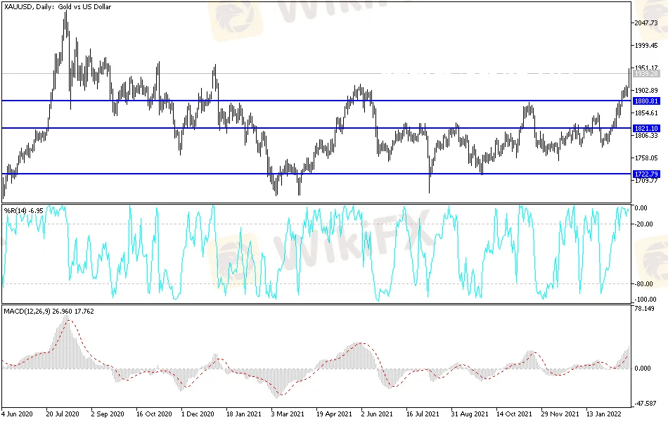 According to the technical analysis of gold: With today's gains and the gold price reaching the resistance level of $1950, there has been talk about the historical psychological peak of $2000 again, and even went beyond that in the event of a Russian war with Ukraine. Everything is hinging on this crisis, and accordingly, the declines will remain an opportunity for gold investors to buy. The closest support levels for gold are currently $1920 and $1885.
