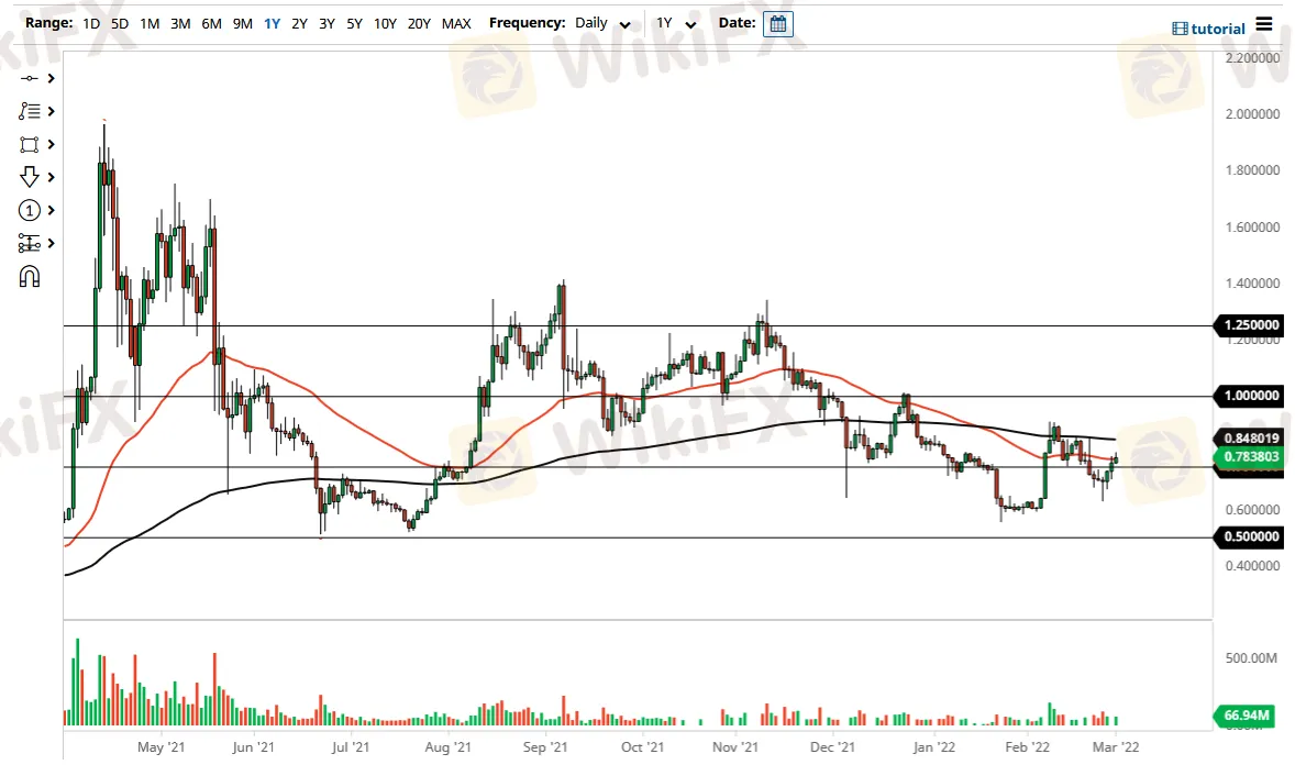 Ripple broke above the $0.75 level over the last couple of days, which suggests that perhaps we are ready to go higher based upon the fact that we have formed a nice “V bottom.” It is worth noting that the 50 day EMA has offered a little bit of resistance, so that causes a certain amount of trouble. Ultimately, I think this is a market that not only has to worry about that technical indicator, but also the 200 day EMA.