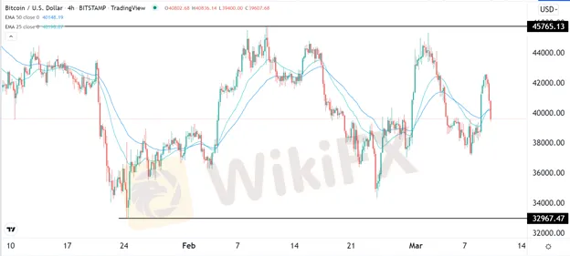The four-hour chart shows that the BTC/USD pair has been in a wide range in the past few weeks. It has found strong resistance at about 45,600 and support at about 33,000. Therefore, we can argue that this rebound does not mean that a new bullish trend has formed since it is inside the range.