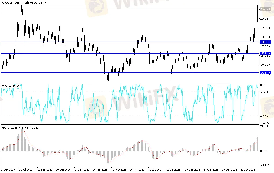 According to the technical analysis of gold: There is no doubt that the recent gains in the gold market pushed the technical indicators towards strong saturation levels, but it is necessary to consider that the continuation of the Russian war and its negative consequences on the future of global economic recovery and the plans of global central banks provide a fertile environment for the price of gold to continue breaking new historical highs. Accordingly, the purchase will be in a limited space with the placement of stop-loss orders, as everything is expected considering the continuation of the crisis. Currently, the closest targets for the bulls are 2085 and 2110, respectively.
