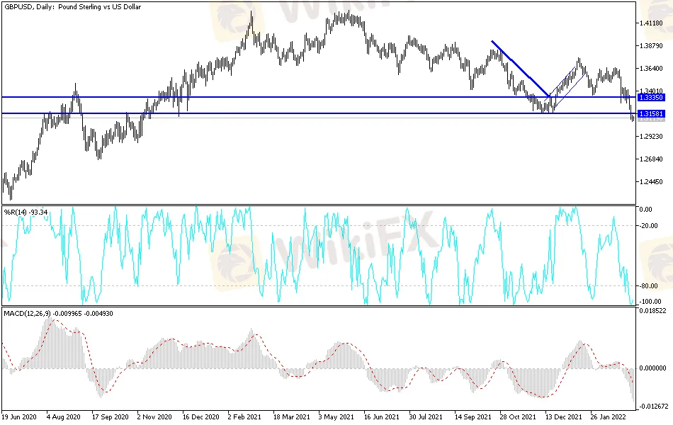 According to the technical analysis of the pair: The general trend of the GBP/USD currency pair is still bearish and attempts to exit the current bearish channel will not succeed without moving above the 1.3335 resistance so far, the bears are still determined to break the psychological support 1.3000, especially if the Russian war continues and impose more of the international sanctions, which impede the efforts of global economic recovery.
