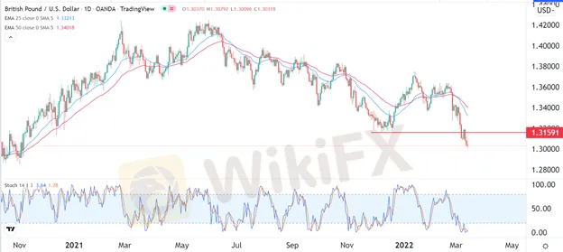 The daily chart reveals that the GBP/USD pair has been in a strong bearish trend in the past few days. The sell-off accelerated when the price moved below the key support level at 1.3160, which was the lowest level this year.