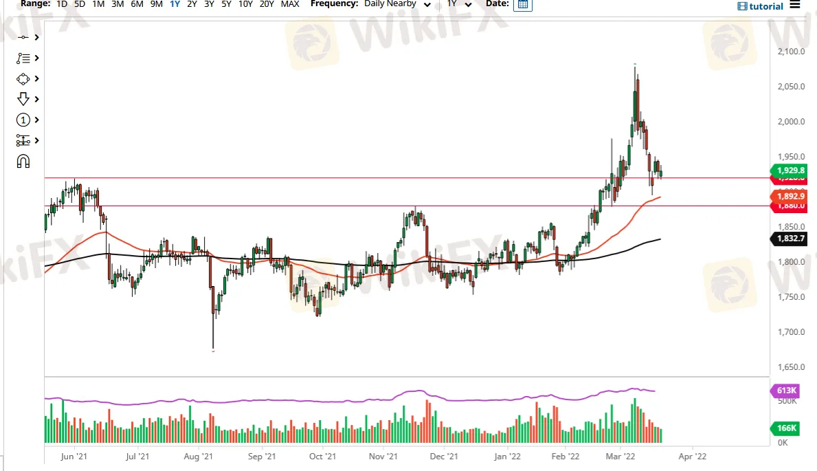 If we break down below the $1880 level, then we could see a much larger drop down from there, reaching down towards the 200-day EMA. The market at that point would have wiped out a lot of gains, and we should more than likely go much longer, perhaps reaching down towards the $1800 level and beyond. I do not think we are getting ready to do that, but you need to keep an open mind just in case the market suddenly lurches against you.