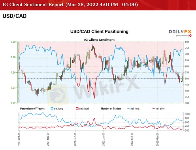 The IG Client Sentiment report shows 73.18% of traders are currently net-long USD/CAD, with the ratio of traders long to short standing at 2.73 to 1.