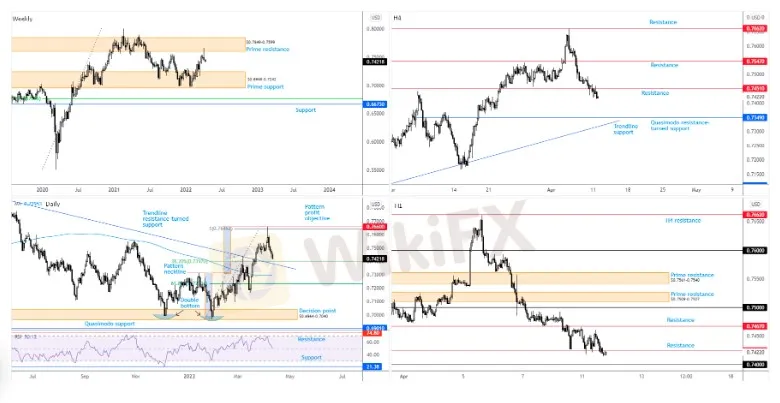 While the daily timeframe remains above its 200-day simple moving average at $0.7295, the overall trend pointing lower and weekly price dropping from prime resistance at $0.7849-0.7599 indicates sellers may remain at the wheel. Consequently, further selling below H1 resistance at $0.7424 could be seen, targeting at least $0.74 (and daily support structure). Any downside beyond $0.74 shines light on H4 Quasimodo resistance-turned support at $0.7349.