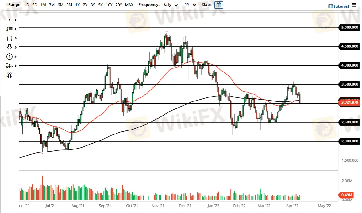 Abstract:Ethereum fell rather significantly on Monday, initially trying to rally before selling off. The market sliced through the 50-day EMA, as well as the 200-day EMA. The $3000 level is a large, round, psychologically significant figure, which will attract a certain amount of attention. We have bounced ever so slightly from there, but closed toward the bottom of the candlestick, suggesting that we could get a little bit of a continuation from here.