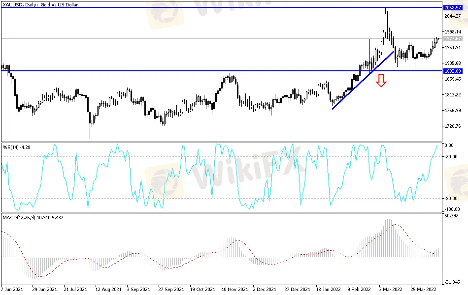 Technical expectations for the gold price: The bullish trend in the gold market is getting stronger, and the price of an ounce of gold crossed the 1975 dollar barrier. Expectations may increase again to move towards the next historical psychological resistance level of 2000 dollars an ounce at the earliest. This is especially if the gold market continues to ignore the trend of global central banks to further tighten their policy. Global geopolitical tensions and the persistence of the epidemic will remain the most important factors supporting the bulls' dominance.