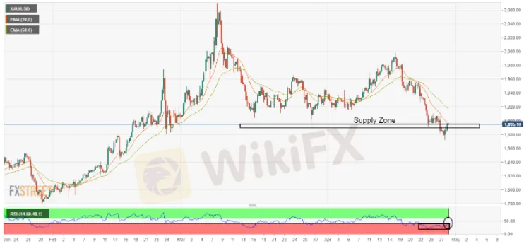 On a four-hour scale, XAUUSD is bid around the supply zone placed in a narrow range of $1,890.21-1,895.15. The asset is facing barricades near the 20-period Exponential Moving Average (EMA) at $1,898.10. While the downward trending 50-EMA at $1,917.90 is still advocating bears. The Relative Strength Index (RSI) (14) is attempting a range shift from 20.00-40.00 to 40.00-60.00, which could signal a short-lived reversal.