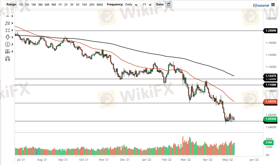 I wrote on 4th May that the price had been consolidating and finding a great deal of support at the big round number of $1.0500. I thought the FOMC release that day might trigger a decisive breakdown below that round number. In fact, the bearish consolidation has continued, with the price fluctuating without direction just above it. Technically, the situation has not changed – the price continues to look very vulnerable to a bearish breakdown below the consolidation zone, just as it has for the past couple of weeks.