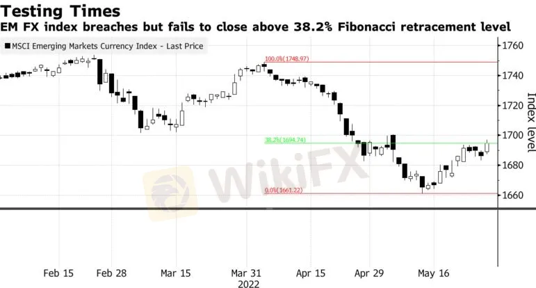 This month‘s rebound in emerging-market currencies is set to falter, if technical indicators and economic forecasts are any guide.A rally of about 2% in the MSCI Emerging Markets Currency Index has pushed the gauge to overbought territory on key momentum measures, just weeks after it climbed off an 18-month low. The basket of currencies is also yet to close above key resistance on closely watched Fibonacci charts. The deteriorating outlook for world growth adds to the headwinds, with the danger that China’s slowdown, the war in Ukraine and aggressive interest rate hikes combine to trigger recession across the globe. Its a scenario the World Bank has warned of, and one that would see money flow into dollar-denominated haven assets at the expense of developing economies.“There are plenty of risks to global growth that could support the dollar and undermine EM currencies into the medium-term,” said Jane Foley, head of FX strategy at Rabobank in London, who is cautious about emerging-market assets.