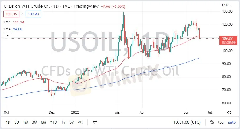 The West Texas Intermediate Crude Oil market had a rough trading session on Friday as most assets did. We sliced through the $110 level, and the 50-day EMA. The size of the candlestick is rather brutal, and it suggests that we will have a further downside. Ultimately, I think this is a market that will find buyers eventually, so Im waiting for signs of stabilization that I can take advantage of. I have no interest in shorting oil anytime soon because it has been so out of control bullish. The market continues to dance between the idea of a lack of supply, but at the same time the global economy slowing down. Because of this, I think we continue to see a lot of noisy behavior and it is probably only a matter of time before we have to break in one direction or the other.