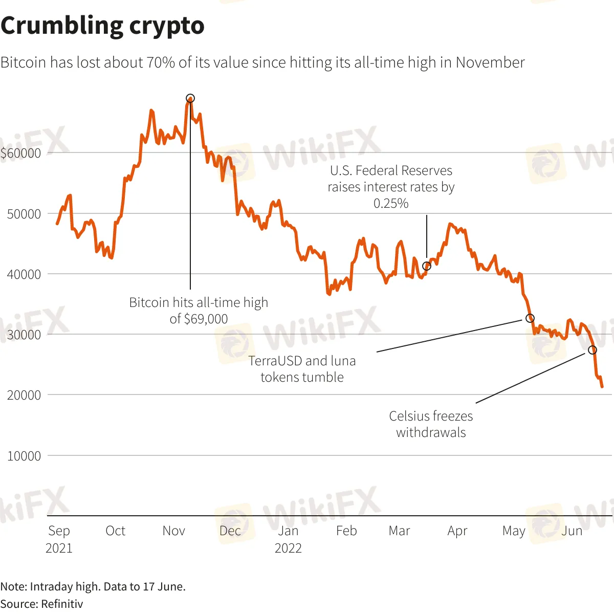 Bitcoin fell below $20,000 on June 18 for the first time since December 2020. It has plummeted around 60% this year. The overall crypto market has slumped to around $900 billion, down from a record $3 trillion in November.