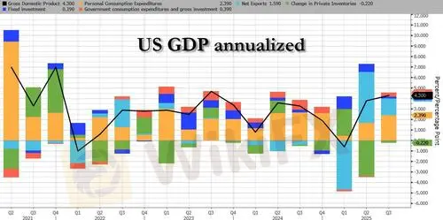 Inflation-adjusted gross domestic product increased at a revised 4.4% annualized rate, the fastest in two years, and up 0.1% from the initial estimate, primarily reflecting upward revisions to exports and investment that were partly offset by a downward revision to consumer spending. That said, the change was minuscule: it went up from an unrounded 4.340% to 4.370%.