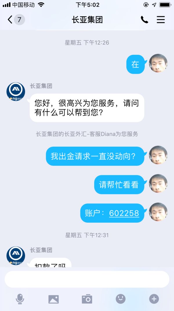 2020年3月20号我从长亚出金32.7美金(从始至今我已经入金4000多美金)一直到今天2020年4月9日依然给我的回复是:耐心等待 这敷衍的话。今天我总算明白这家公司的黑心,我看我那一点点的几十美金是回不到自己腰包了。但是我必须让投资者都知道这家长亚集团公司是多么的无赖,希望投资者们以后千万不要被这家公司给骗了。我倒霉我亏了我认了,谢谢大家