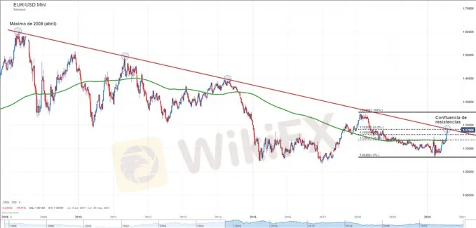 El precio se encuentra a poca distancia de una zona de resistencia clave cerca de los 1.1820. En esta región, el retroceso de Fibonacci de 61.8% del movimiento bajista de febrero de 2018 a marzo de 2020 converge con una directriz descendente de largo plazo extendida desde abril de 2008.