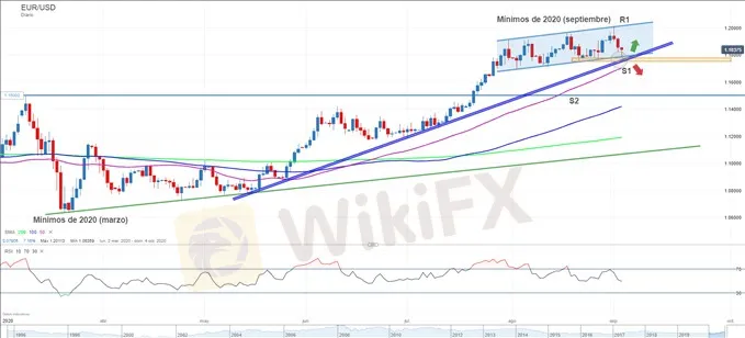 Los descensos del EUR/USD parecen ser parte de un pull-back técnico (toma de ganancias), después de una subida de casi 600 pips desde principios de julio. Otro factor que parece pesar sobre el tipo de cambio es la inquietud del Banco Central Europeo por el fortalecimiento de la moneda común, que ha repuntado más del 11% desde sus mínimos del 2020.