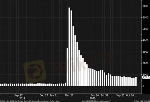 Esta es la segunda semana de ascensos en las reclamaciones semanales, algo que apunta a una desaceleración del crecimiento en el país. A pesar del progreso en torno a las vacunas por parte de diferentes farmacéuticas, la Covid-19 continúa afectando el día a día de los estadounidenses. Ayer se reportaron más de 2100 muertes en el país, y es que el país lleva más de tres semanas sumando más de 100 000 casos por día. Las hospitalizaciones por lo tanto también han visto un incremento, con 88 000 nuevos pacientes ayer, el máximo desde el comienzo de la pandemia.