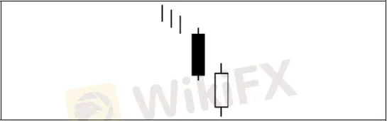 El sentimiento bajista se ve aumentado por la larga vela del primer día. El mercado forma un hueco el segundo día a la baja pero no puede continuar la tendencia bajista. Las fuerzas alcistas intentan un contraataque pero muy débil que sólo consigue llegar hasta cerca del cierre del día anterior y todo indica que la poca fuerza del rebote hará que la tendencia continúe.