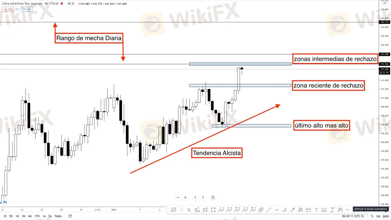 De tener un volumen adecuado, el precio podría romper con fuerza por encima de los 141.766, llevando el movimiento del par a cubrir el rango de la mecha diaria que se encuentra entre los 141.766 y los 142.713. Dentro de este rango se presentan dos escenarios de compra, uno conservador y uno de moderado riesgo, siempre y cuando mantenga el movimiento por encima de las zonas intermedias de rechazo; lo que dejaría la entrada conservadora por encima de los 141.988, con un SL sugerido de 20 PIPS y la entrada de riesgo moderado en los 141.766 con un SL sugerido de 25 pies.
