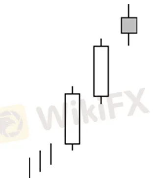 Extracto:Como Identificarlo: Aparece en una tendencia previa alcista Aparecen dos cuerpos blancos largos en los dos primeros dias. El segundo día su cierre es más alto que el del primer día. El tercer día abre cerca del cierre del segundo día El tercer día es típicamente una vela de cuerpo real pequeño, una peonza o estrella fugaz que abre con hueco sobre el segundo día.