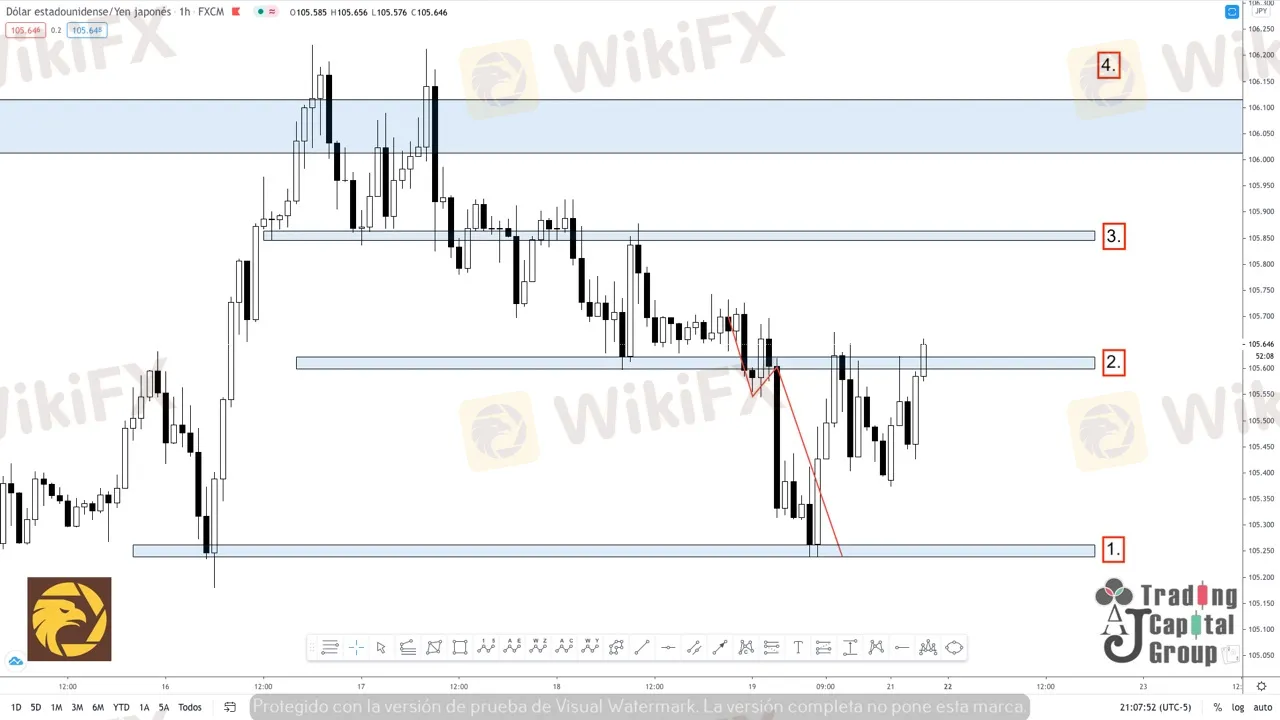 Cabe tener en cuenta que lo que pase en la zona (2) determinará lo que puede llegar a hacer el precio, debido a que puede crearse un fake out que impulse el precio a regresar a la zona (1)
