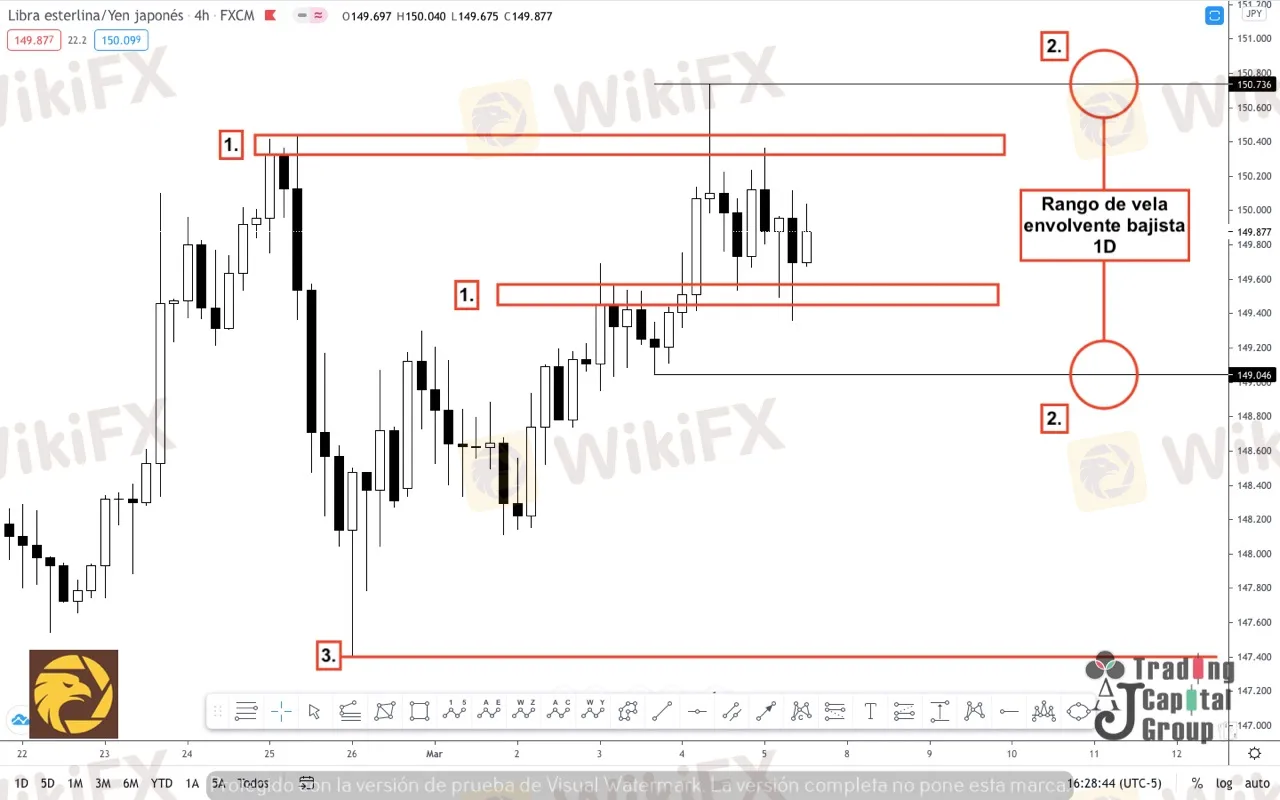 3. Sin embargo la zona de soporte que se encuentra sobre los 147.400 determina un nivel ideal para poder buscar ventas, siempre y cuando el movimiento se mantenga por debajo del rango de la formación envolvente.(2)