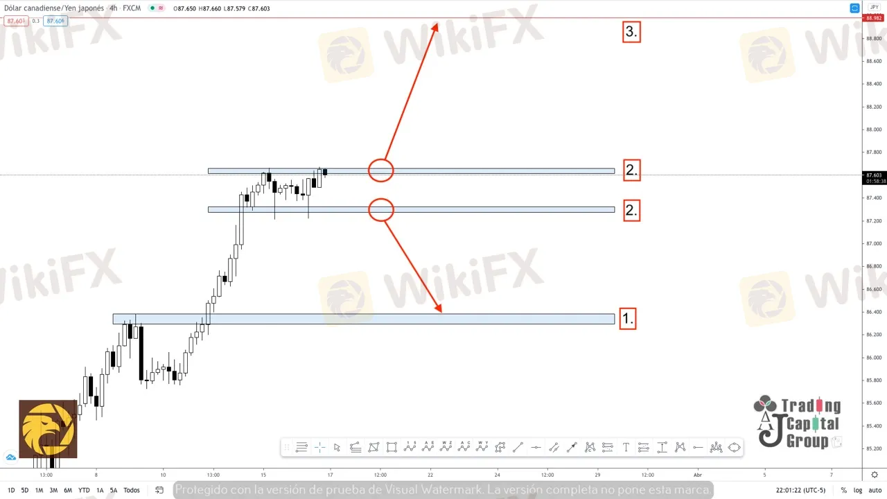 2. Zona determinada como posible zona de distribución, siempre y cuando se consolide un movimiento en venta por debajo de los 87.300. Sin embargo, de mantener el volumen de compra esta zona podría consolidarse como un nivel de participación alcista que permitiría generar beneficios si rompe por encima de los 87.600 y continua su impulso hasta los 89.000 (3) Aproximadamente.