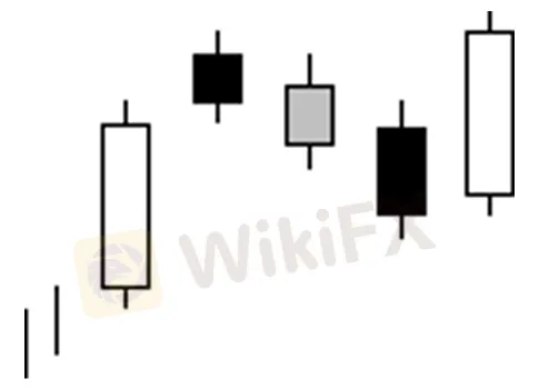Extracto:Como Identificarlo: Existe una tendencia previa alcista en el valor Se forma un candlestick blanco el primer día En el segundo día y tras apertura con un hueco al alza se forma una pequeña vela negra Se forma una secuencia de cuerpos reales pequeños que constituyen una breve tendencia bajista pero que permanece dentro del rango de la vela del primer día Finalmente en el quinto día a través de una vela blanca larga alcista cierra por encima de todos los máximos anteriores y dando fin a la figura para seguir su camino alcista.