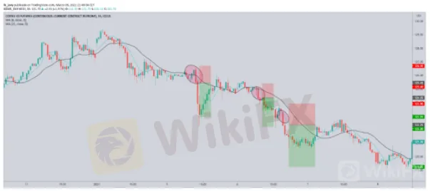 Aquí el ejemplo, la temporalidad es M15 y se ve claramente como estamos ante una tendencia bajista, las entradas son los círculos marcados en rojo. La primera entrada se hizo cuando la media móvil de 8 periodos estaba por debajo de la de 21 y la vela envolvente cerró por debajo de las dos.