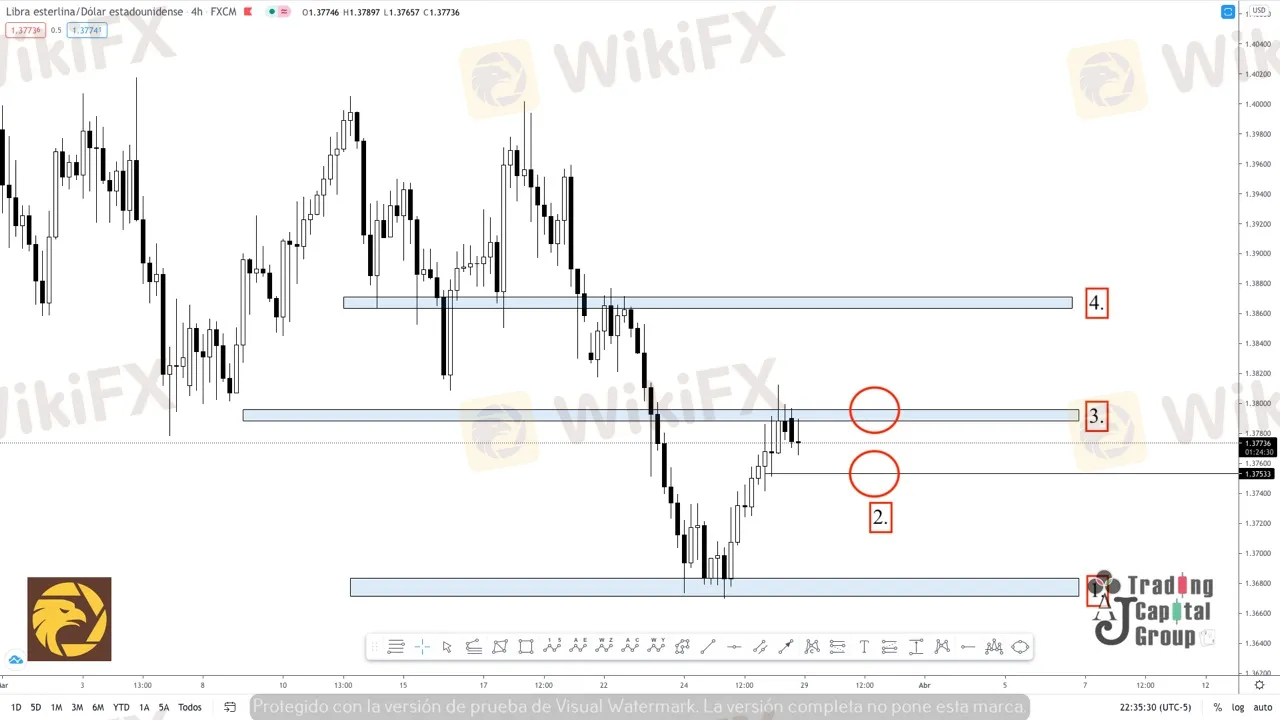 2. Se determina como una zona de entrada en tanto el precio continue el movimiento bajista, siempre y cuando el activo rompa y retestee dicha zona de los 1.37533