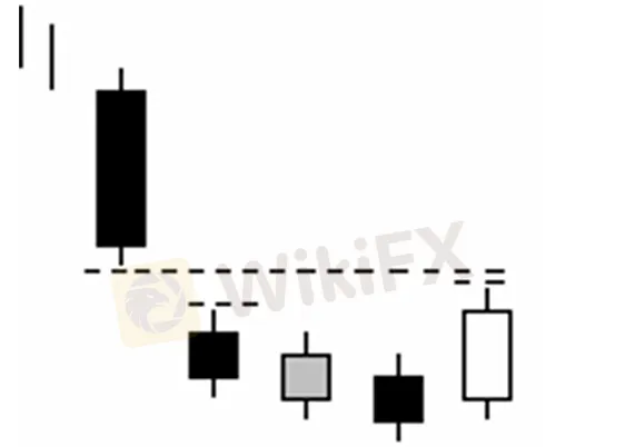 Extracto:Como Identificarlo: El mercado se mueve en tendencia bajista Se forma una vela negra larga el primer día. El Segundo día es una vela negra con cuerpo real pequeño que abre con gap bajo la vela del primer día. El tercer y cuarto día se van formando otras dos velas blancas y/o negras con cuerpos reales pequeños (spinning tops) que continuan en la dirección del segundo candlestick formando cierres de mínimos consecutivos. El quinto día es una larga vela blanca que cierra dentro del gap aparecido entre el primer y Segundo día.