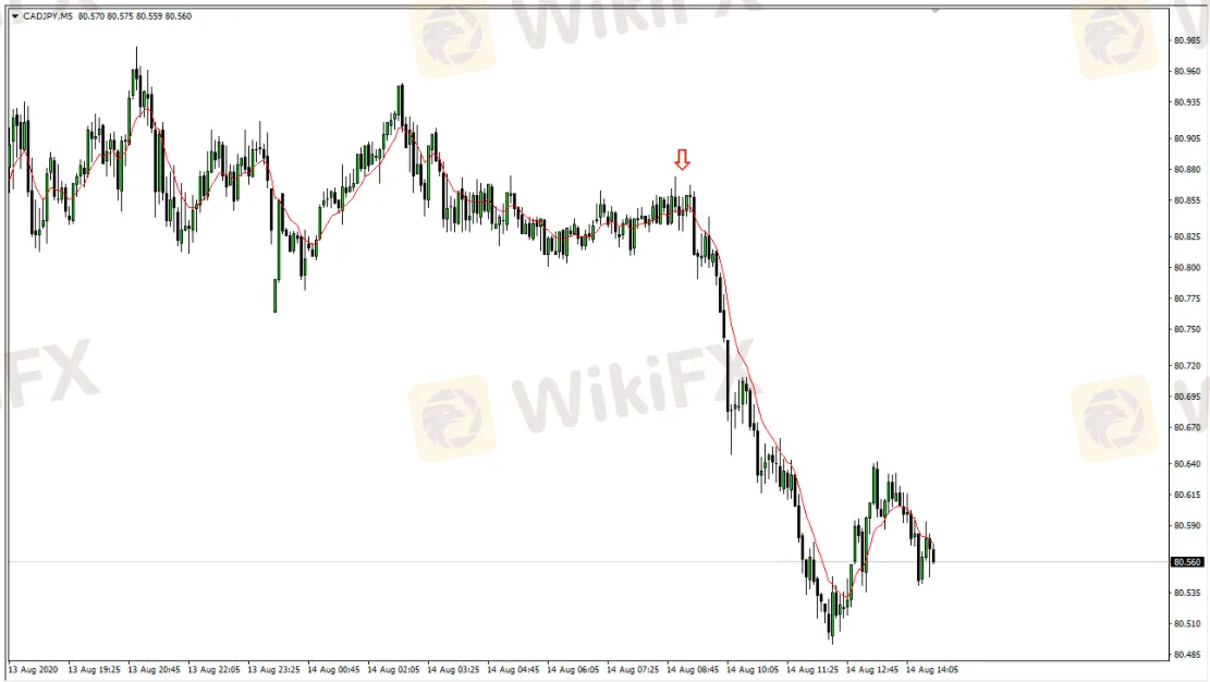 Por ejemplo, puedes usar un promedio móvil exponencial para determinar la tendencia a largo plazo, pero también puedes esperar hasta que tu promedio móvil exponencial favorito a corto plazo se alinee con el más grande. Como ejemplo, puedes usar la EMA de 200 días para determinar la tendencia a largo plazo y esperar a que la EMA de 9 se vuelva a tu favor en los gráficos a corto plazo, la cual te darán una señal de trading como se muestra abajo. Observe cómo tan pronto como la EMA 9 descendió, comenzó una tendencia más grande para el resto del día en el gráfico de cinco minutos. Esto también coincide con la tendencia a la baja en el gráfico diario. Esto puede mantenerte en la misma dirección que el "gran dinero", y quizás aún más importante, el "gran impulso".