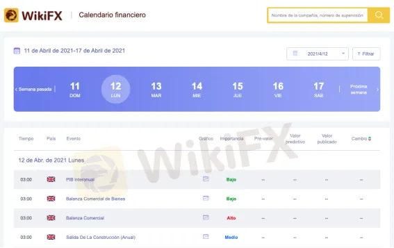A continuación se muestra el calendario financiero de WIKIFX. Es un ejemplo de calendario gratuito.