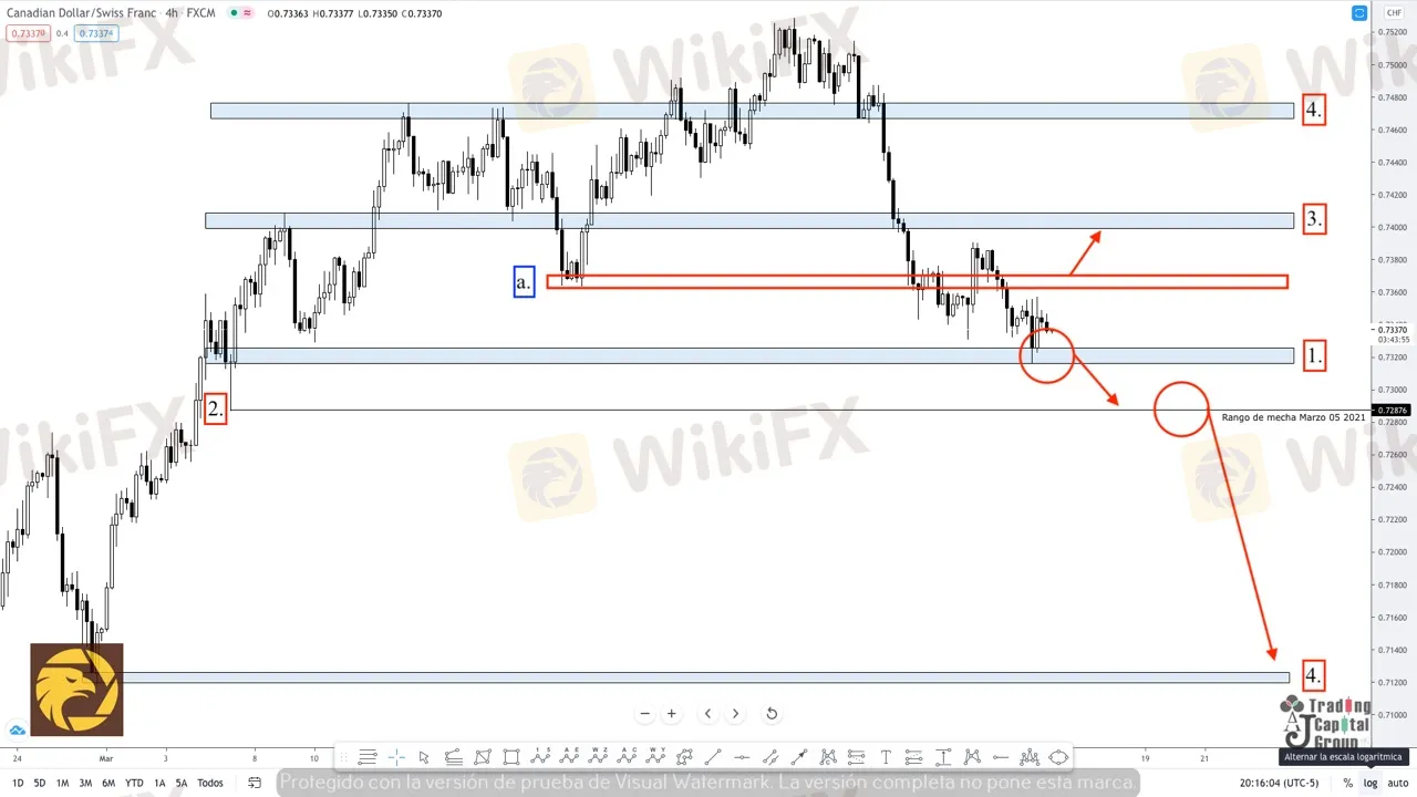 3. De crear un volumen de compra el precio, debería pasar con fuerza la zona (a.), que es un nivel de acumulación intermedio y que llevo al precio a crear un rally alcista importante las semanas anteriores. De ser así, el precio podría continuar su impulso hasta los 0.74800 (4)