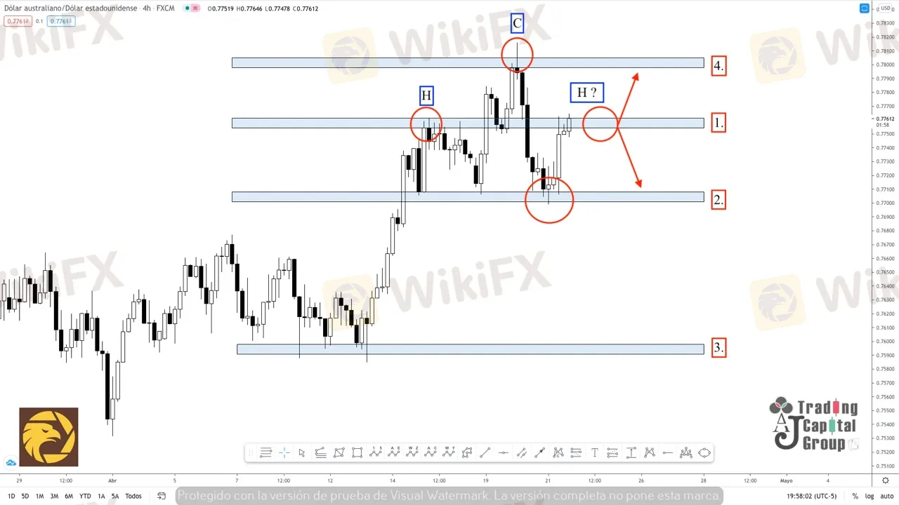 2. Así pues, de completarse la estructura (H-C-H). Este nivel podría determinar el punto de entrada en venta del precio, pues es en la zona de los 0.77050 que aparece la linea de cuello de la estructura para consolidar dicho patrón.