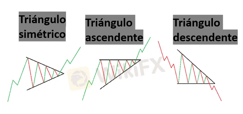 Hay principalmente tres tipos de triángulos: el triángulo ascendente, el triángulo descendente y el triángulo simétrico. Además, los patrones de cuña también se pueden considerar patrones triangulares, pero con una ligera variación. En las cuñas, ambas líneas de tendencia apuntan hacia abajo o hacia arriba y parecen estar convergiendo.