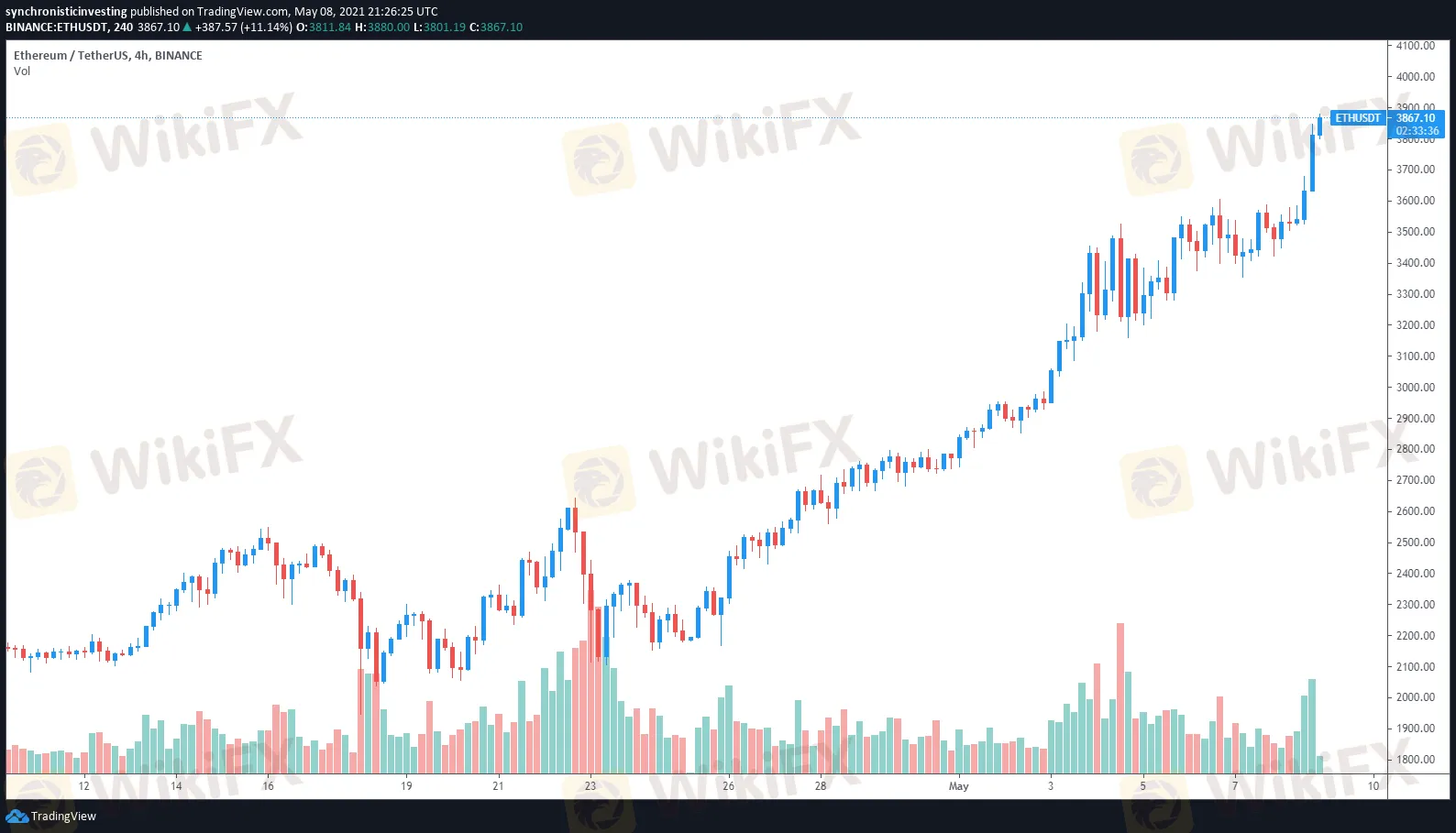 Datos de Cointelegraph Markets y TradingView muestran que después de caer brevemente a un mínimo de USD 3,418 en las últimas horas del 8 de mayo, el precio de Ether recuperó la compostura y procedió a subir un 13% para alcanzar un nuevo máximo histórico de USD 3,958.