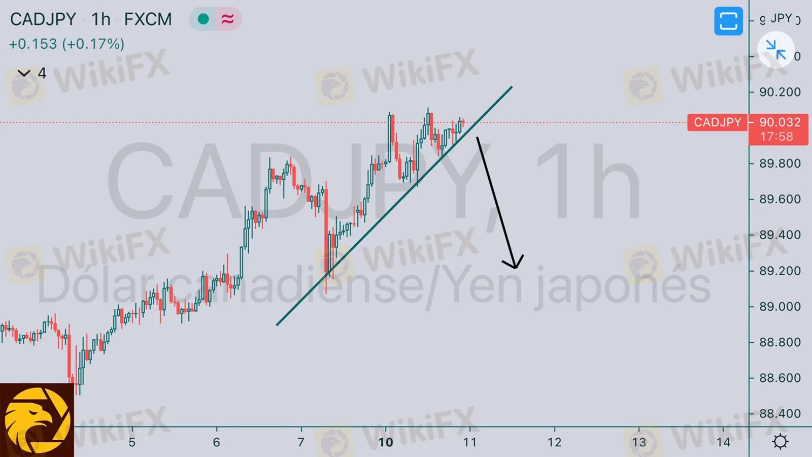 CADJPY tas un fuerte sprint a la alza podemos ver una línea de tendencia formada podemos esperar una ruptura en la sesión de londres para buscar ventas a partir del precio 89.949