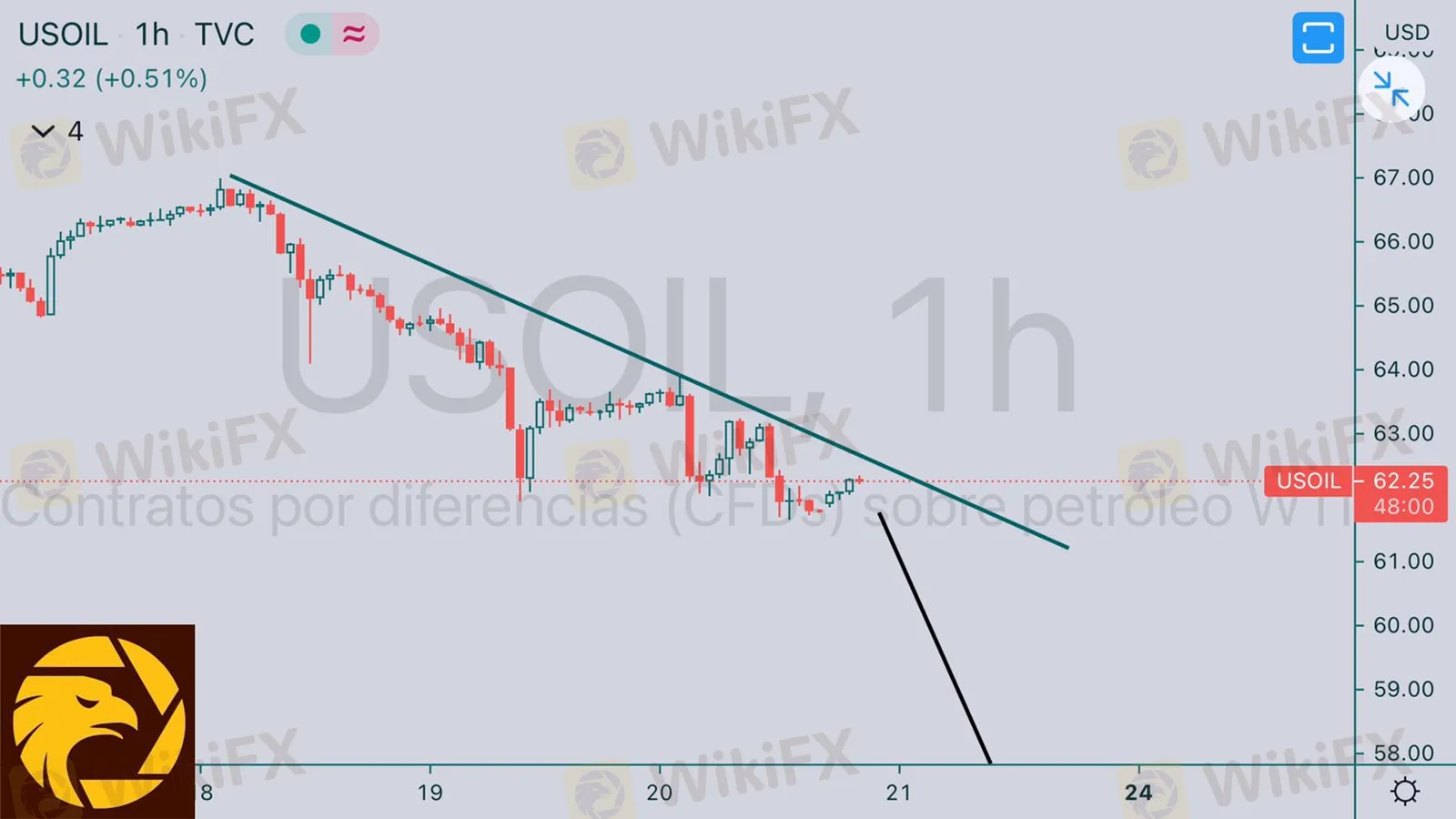 WTI o petróleo west texas vemos que luego de sus maximos de 2 meses el precio tiende a corregir sobre todo ante el acuerdo de Estados Unidos se irán que podrían dispara la oferta en el mercado por lo que podemos buscar ventas a partir del precio 61.65 buscando beneficios buenos.