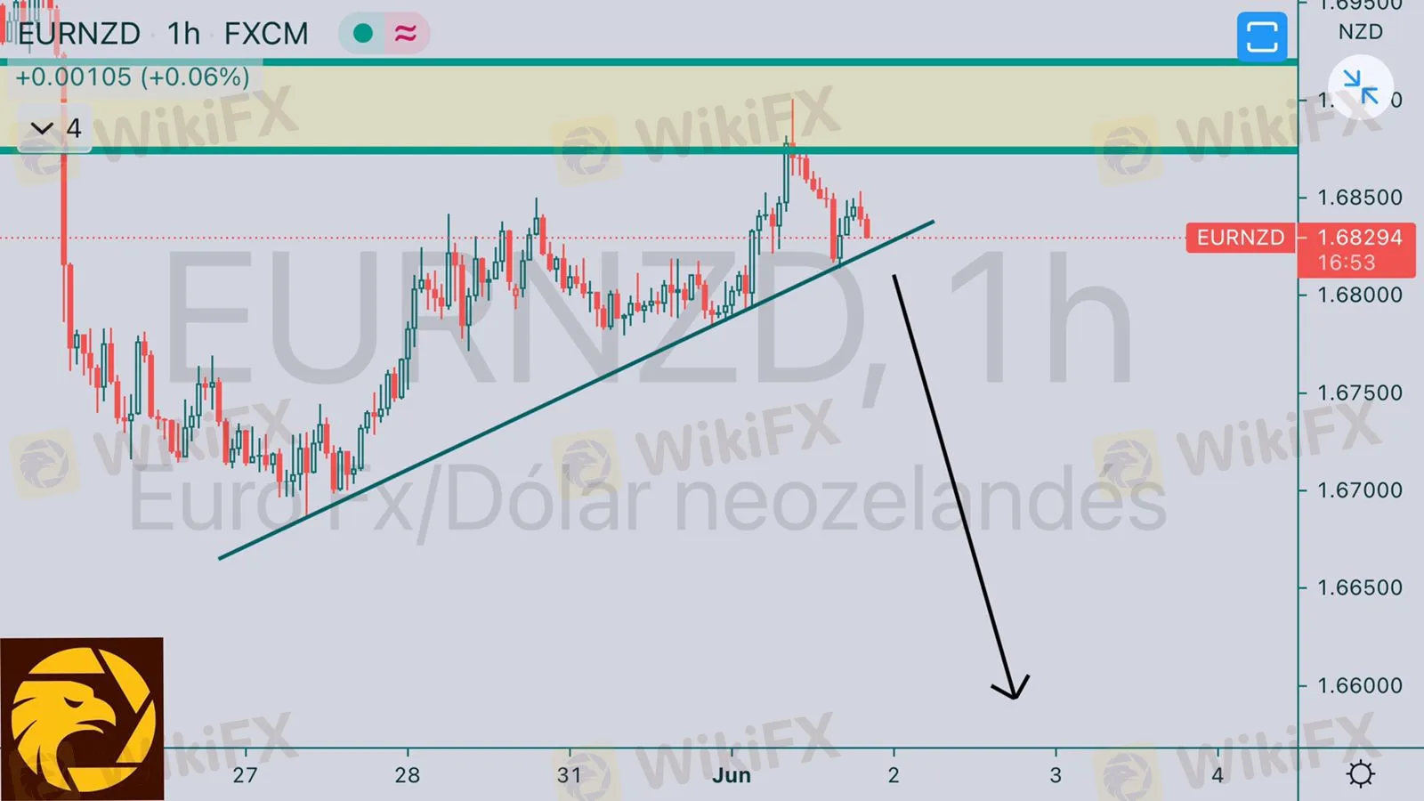 EURNZD zona de soporte fuerte testeada e intentando a la baja esperaremos que rompa la línea de tendencia para tomar ventas a partir del precio 1.68000