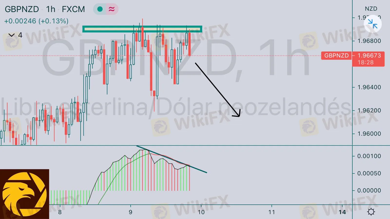 GBPNZD divergencia en el MACD y triple techo lo que nos da alta probabilidad de vender. Podemos buscar ventas a partir del precio 1.96500