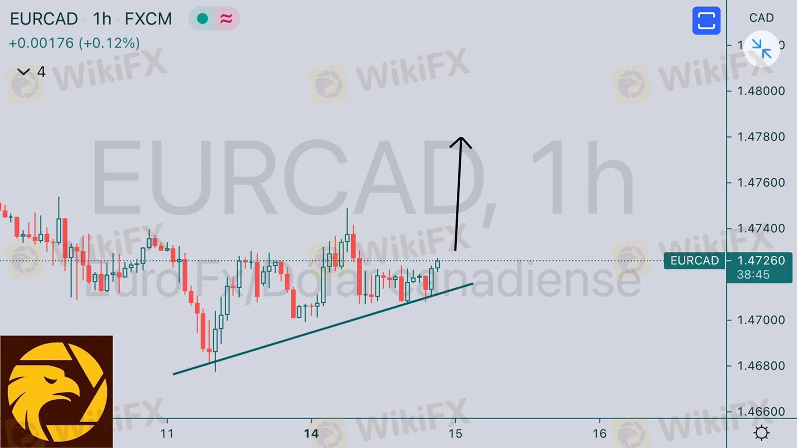 EURCAD vemos cómo e precio forma un pequeño banderín y una tendencia alcista es posible que el precio suba así que buscaremos compras a partir del precio 1.47300