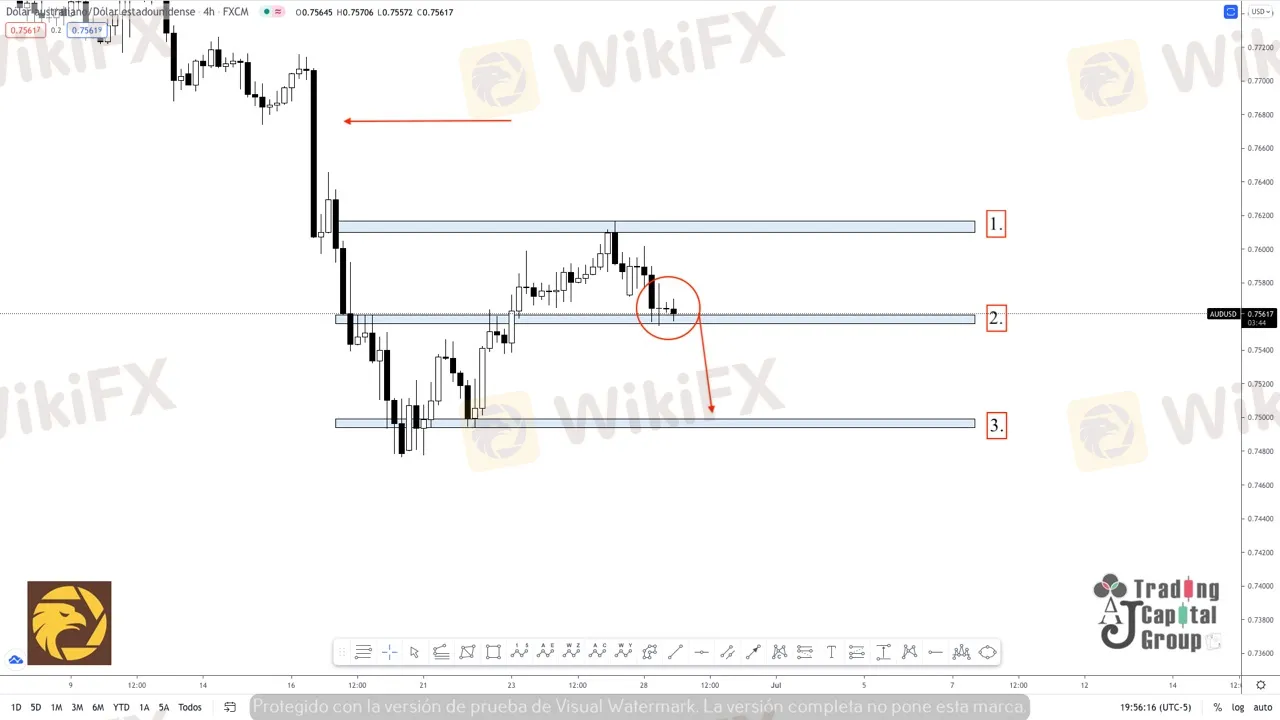 Así mismo es importante hacer un seguimiento adecuado del precio, sobre cada uno de los rangos específicos del precio para poder aprovechar lo movimientos que se generen, pues de recuperar su valor de compra y superar con fuerza el nivel (1), no habría nada que frene la llegada del precio hacia los 0.77100 gracias a que no existe un tráfico importante de velas por encima de la zona (1)