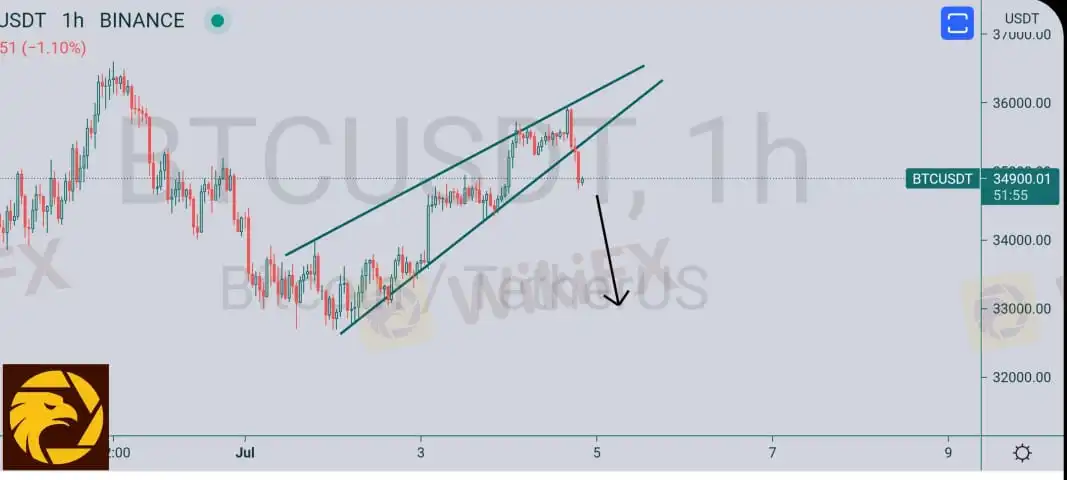 BTCUSD luego del patrón armónico formado en la zona de resistencia en el precio 36.000 vemos como a roto para bajar nuevamente y podemos buscar ventas a partir del precio 34.800