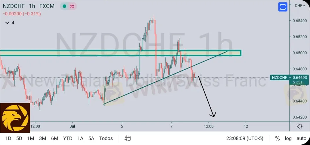NZDCHF luego de un doble techo y la ruptura en la línea de la macro tendencia el precio dispone a realizar su bajada prevista podemos esperar un pullback nuevamente a la zona se resistencia así que buscaremos ventas a partir del precio 0.64593