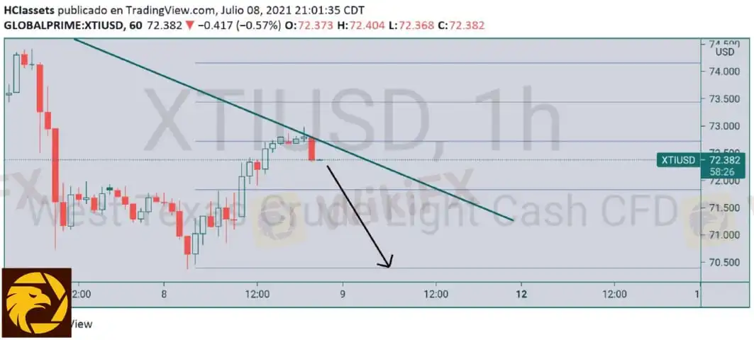 WTI o petróleo westexas vemos que el precio continúa ala baja y está vez cocando con el 38 de fibonacci lo que nos da mayor probabilidad a que siga esta tendencia bajista fuerte que se ha visto desde las noticias de acuerdos OPEP+ podemos buscar ventas a partir del precio 72.200